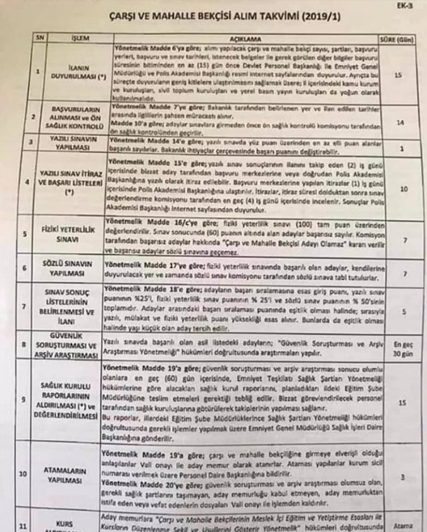 Çarşı ve mahalle bekçisi alımında adaylara uygulanan işlemlerden biri de güvenlik soruşturması ve arşiv araştırması aşamasıdır. Bekçi adaylarının emniyet güçlerine dahil olmadan önce bu aşamalardan pozitif değerlendirme alması gerekmektedir. Bu uygulama tüm diğer memurlara da uygulanmaktadır. 2019 yılı bekçi alımı için kazanan, yedek kazanan ve kazanamayıp elenenlerin duyurulacağı listeler çok yakında açıklanacak. Listelerin duyurulması güvenlik soruşturması ve arşiv araştırması nedeniyle uzamaktadır.