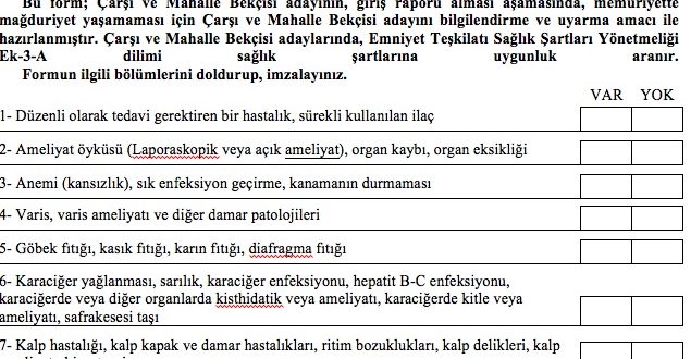 | Bu form; Çarşı ve Mahalle Bekçisi adayının, giriş raporu alması aşamasında, memuriyette mağduriyet yaşamaması için Çarşı ve Mahalle Bekçisi adayını bilgilendirme ve uyarma amacı ile hazırlanmıştır. Çarşı ve Mahalle Bekçisi adaylarında, Emniyet Teşkilatı Sağlık Şartları Yönetmeliği Ek-3-A dilimi sağlık şartlarına uygunluk aranır. Formun ilgili bölümlerini doldurup, imzalayınız. |