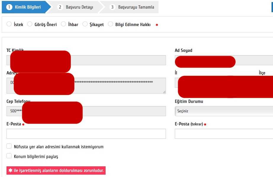 E-devlet girişi yaptıktan sonra arama kısmına CİMER yazıp yeni başvuru seçeneğini seçin. Gelen ekranda en üstte bilgi edinme ve gerçek kişi seçeneklerini seçip e-posta bilgilerinizi girdikten sonra devam edin.