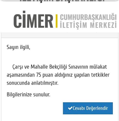 Bekçilik puanınızın kaç olduğunu öğrenmek için yapabileceğiniz tek yol e-devlet üzerinden CİMER’e başvurmak. CİMER(Cumhurbaşkanlığı İletişim Merkezi) üzerinden yapacağını başvuru sonucunda, bir ay içinde sözlü mülakattan kaç puan aldığınız size e-posta ve sistem üzerinden iletilir.