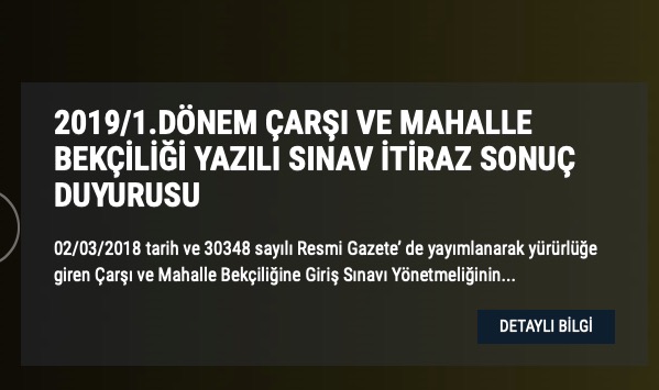 2019 bekçi alımı için yazılı sınava girip istediği puanı alamayan ve hata olduğunu düşünen adayların itirazları bayram öncesi alınmıştı. Bu itirazlar sonucu yapılan değerlendirme sonuçları Polis Akademisi tarafından yayınlandı. 02/03/2018 tarih ve 30348 sayılı Resmi Gazete’ de yayımlanarak yürürlüğe giren Çarşı ve Mahalle Bekçiliğine Giriş Sınavı Yönetmeliğinin Yazılı Sınav başlıklı 13 ve 14’üncü maddeleri kapsamında 13/07/2019 tarihinde 2019/1. Dönem Çarşı ve Mahalle Bekçiliği Yazılı Sınavı yapılmıştır.