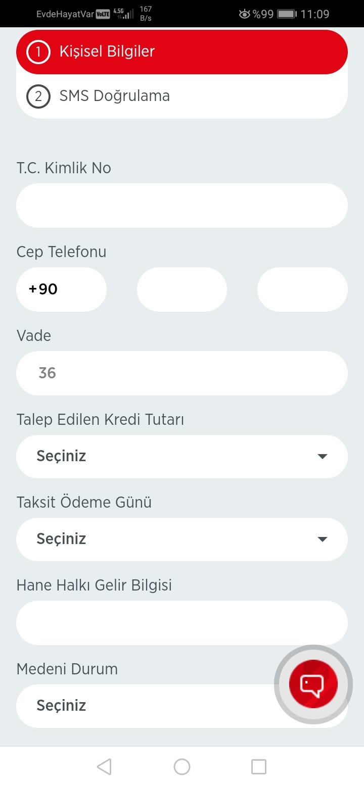 Tc kimlik no, ad soyad, başvuru yapacağınız ay, kredi miktarı, SMS doğrulama için telefon, hane geliri, medeni durumunuz.