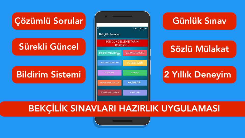 Çarşı ve mahalle bekçiliği giriş sınavlarına yönelik iki yılı aşkın deneyimimizin ürünü olan bekçilik yazılı ve sözlü mülakat hazırlık uygulaması büyük bir güncelleme aldı. Binlerce kullanıcıya hizmet eden uygulamamız hızlı, güncel ve geniş içerik ile bekçi adaylarının yazılı ve sözlü mülakata hazırlanmaları için geliştirildi. Uygulamamızın temel bölümleri şu şekildedir: