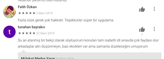 Bu yılki hedefimiz sınav zamanına dek en az bin çözümlü soru ve bin sözlü mülakat sorusunu uygulamamıza eklemektir. Aşağıda uygulamamız hakkında Play Store kullanıcı değerlendirmelerinden bazılarını görebilirsiniz(200 yorumda 5 üzerinden 4.3 ortalama):