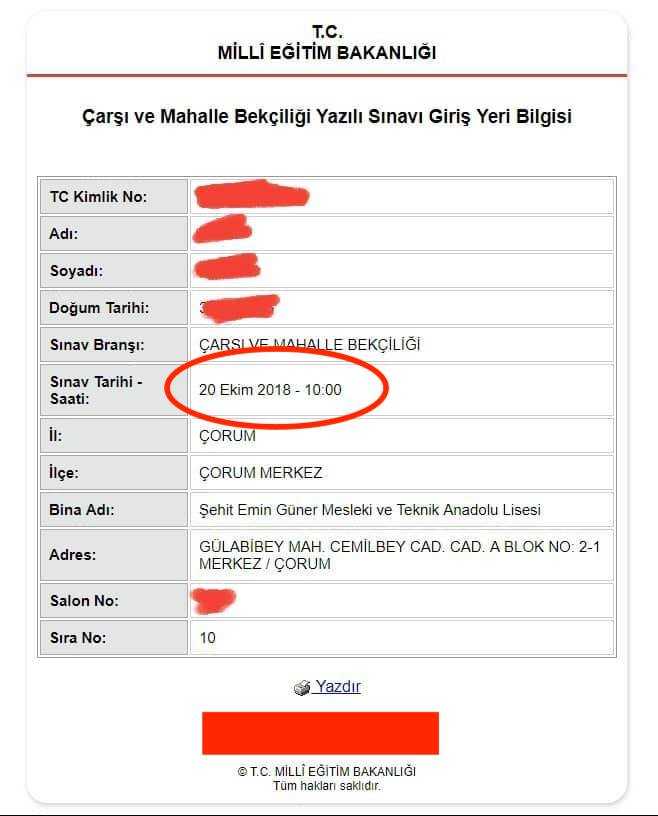 Sınav giriş belgesini sorgulayıp hangi ilde ve hangi okulda yazılı sınava gireceğinizi öğrenebilirsiniz. Yazılı sınav tarihi 20 Ekim 2018 tarihinde yapılacak. Bekçilik sınav giriş belgesi yanında olmayan veya getirmeyen adaylar bekçilik yazılı sınavına alınmayacaklar. Bu nedenle, mutlaka sınav giriş belgesini sorgulayıp çıktısını alın, unutmayın. Bazı bekçi adayları, sınav süreci için yapılan duyuruyu tam okumamakta ya da duyurudan haberdar değiller. Sitemize hala yazılı sınav hangi saatte yapılacak diye sorular geliyor. Bu konuda mağduriyet olmaması için bu makaleyi kaleme aldık.
