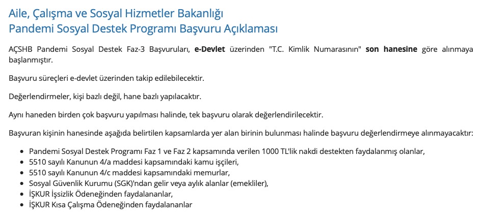 AÇSHB Pandemi Sosyal Destek Faz-3 Başvuruları, e-Devlet üzerinden “T.C. Kimlik Numarasının” son hanesine göre alınmaya başlanmıştır. Başvuru süreçleri e-devlet üzerinden takip edilebilecektir. Değerlendirmeler, kişi bazlı değil, hane bazlı yapılacaktır. Aynı haneden birden çok başvuru yapılması halinde, tek başvuru olarak değerlendirilecektir. Başvuran kişinin hanesinde aşağıda belirtilen kapsamlarda yer alan birinin bulunması halinde başvuru değerlendirmeye alınmayacaktır: