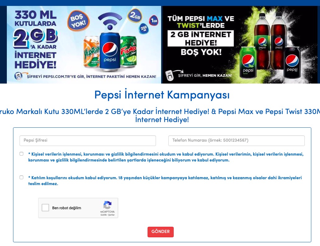Pepsi firmasının max ve siyah teneke kolaları ile 2.5L şişelerinde kapak kodları ile 2 GB, normal pepsi teneke içeceklerinde ise 25MB 500MB 1GB ve 2GB internet hakkı dağıtılmaktadır. Kampanyanın tek sınırlaması günlük 1 defa faydalanılabilmesidir. Günde bir defa internet alabilir ve 24 saat içinde kullanabilirsiniz. Ücretsiz internetiniz tükenince tekrar faydalanabilir böylece ayda 60GB kadar mobil internet kullanabilirsiniz.