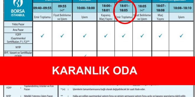 Borsaİstanbul örneğinden yola çıkarak karanlık oda tabirini daha net açıklayabiliriz. Borsaistanbul hafta içi 18:00’de kapanır. 18:00 ve 18:01 arasında kapanış ve marj yayını yapılır. 18:01 ve 18:05 arasında ise karanlık oda dediğimiz alış ve satış emirleri toplanır. Bu bölge bilinmediği için karanlık oda tabiri ile ifade edilir. Hisseler karanlık odaya girer ve alım-satım emirleri işlenir. 18:05’de son fiyat açıklanır hisse karanlık odadan çıkar. Karanlık odadaki işlemleri görmek için Borsaİstanbul için lisans satın almanız gerekir. Bu işlemler 7-8 dakika kadar sürebilir.