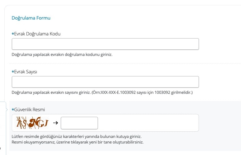 - Evrak Sayısı -Doğrulama yapılacak evrakın sayısını giriniz. (Örn:XXX-XXX-E.1003092 sayısı için 1003092 girilmelidir.)