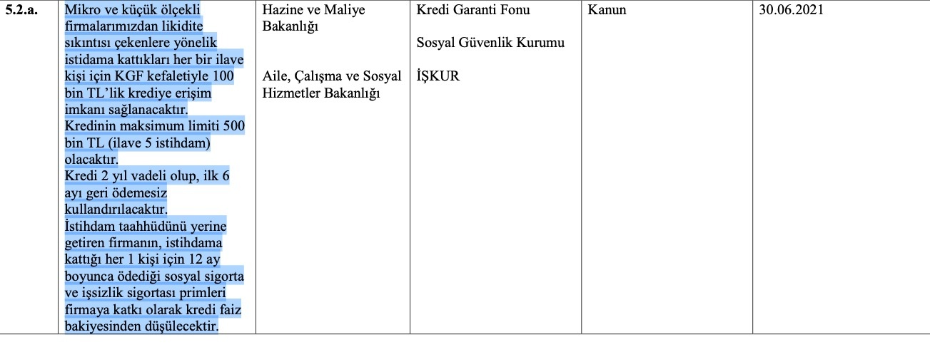 2021 yılı zorlu bir dönem olarak devam ediyor. Hükümet, zor durumda olan esnaf ve ticaretle uğraşan insanımıza 500.000 TL kadar Kredi Garanti Fonu(KGF) kapsamında düşük faizli nakit para sağlayacak. Mikro ve küçük ölçekli firmalarımızdan likidite sıkıntısı çekenlere yönelik istidama kattıkları her bir ilave kişi için KGF kefaletiyle 100 bin TL’lik krediye erişim imkanı sağlanacak. Kredinin maksimum limiti 500 bin TL (ilave 5 istihdam) olacaktır. Kredi 2 yıl vadeli olup, ilk 6 ayı geri ödemesiz kullandırılacaktır. İstihdam taahhüdünü yerine getiren firmanın, istihdama kattığı her 1 kişi için 12 ay boyunca ödediği sosyal sigorta ve işsizlik sigortası primleri firmaya katkı olarak kredi faiz bakiyesinden düşülecektir.