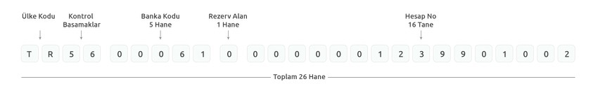 İBAN kodu içerisinde aşağıdaki bilgiler yer almaktadır. İBAN’ın alakalı olduğu hesaba göre aşağıdaki veriler işlenmekte ve benzersiz iban numarası oluşturulmaktadır.