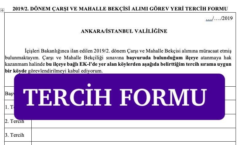 2019 2. dönem çarşı ve mahalle bekçiliğine başvuran İstanbul ve Ankara ataması adayı kişilerden istenilen belgelerden biri de tercih formu dur. Bekçi adayları, 2. dönem başvurusunda bulunduysa diğer evraklarla birlikte tercih formunu da doldurup hazırlamalıdır. 1. dönem adayları için tercih formu istenmiyor. TERCİH FORMU EK-1 TERCİH EDİLECEK KÖYLER 2019/2. DÖNEM …