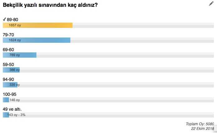 Bekçi adaylarının 7 bin kontenjanlı 1. dönem alımı için parkur ve sözlü mülakat sınavları devam ediyor. On binler bekçi olmak için polis okullarında gece yarılarına dek parkura giriyor, sözlü mülakat komisyonu karşısına çıkıyor. Tüm bu süreçte adayların yaşadıklarını ve sözlü mülakatlarda sorulan soruları sizlerle paylaştık. İlgili konularımızdan okuyabilirsiniz. Geçtiğimiz hafta yazılı sınav anketi yapmış ve %85 oranında adayın yazılıdan başarılı olduğunu öğrenmiştik. Üstelik adayların çoğu 80 ile 95 puan arası bir yazılı puanı elde ettiklerini söylemişlerdi. işte o anketimizin son durumu: