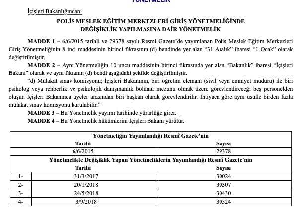 MADDE 1 – 6/6/2015 tarihli ve 29378 sayılı Resmî Gazete’de yayımlanan Polis Meslek Eğitim Merkezleri Giriş Yönetmeliğinin 8 inci maddesinin birinci fıkrasının (d) bendinde yer alan “31 Aralık” ibaresi “1 Ocak” olarak değiştirilmiştir.