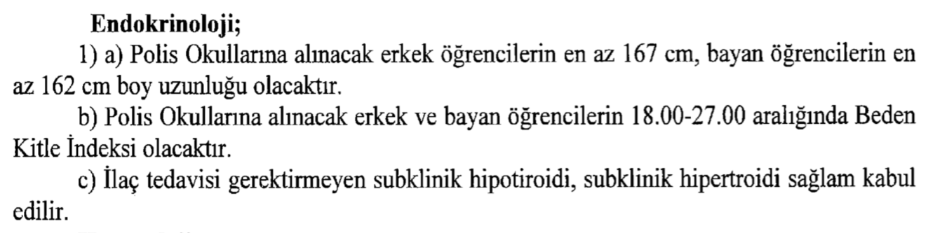 Bu maddeden de anlaşılacağı üzere polis adaylarında vücut kitle endeksi olarak (boy-kilo oranı)  18(dahil) ve 27(dahil) aralığında olmalıdır. Aynı zamanda boyunuz erkeklerde 167 cm, kadınlarda 162 cm ve üstü olmak durumundadır. Bu iki şartı da sağlamalısınız. Yani Vücut kitle oranınız da tutmalı, boyunuz da. Boyu kısa olup beden kitle oranı tutsa bile elenirsiniz. Aşağıdaki hesaplama motoru ile beden kitle oranınızı yani boy-kilo değerinizi ölçebilirsiniz: