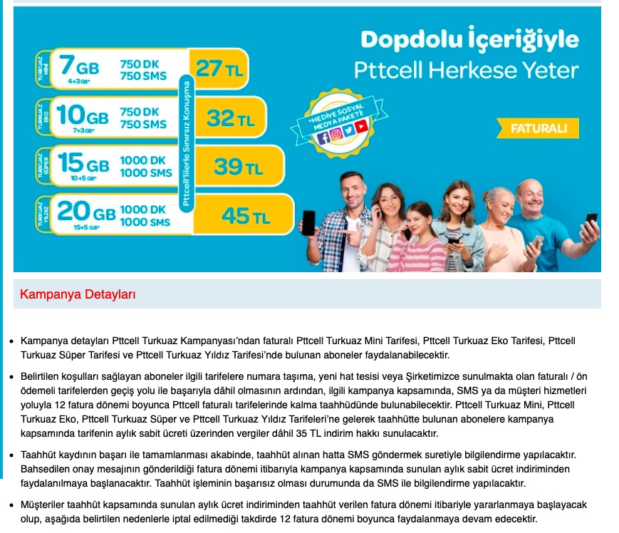 Pttcell, Turkuaz tarifeleri ile faturalı abonelerine tüm hizmetleri tek pakette sağlıyor. Pttcell abonesi olanlar faturalı aboneliklerde 15GB mobil internet, 1000DK her yöne konuşma ve 1000 sms hakkına 39TL aylık bedelle sahip olabilirler. Tarifeden faydalanmak için: