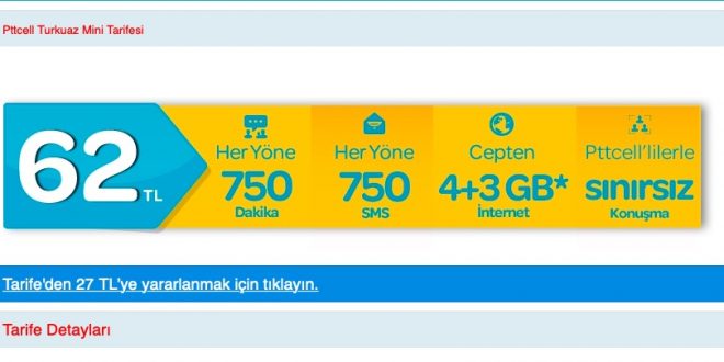 Pttcell, Turkuaz tarifeleri ile faturalı abonelerine tüm hizmetleri tek pakette sağlıyor. Pttcell abonesi olanlar faturalı aboneliklerde 20GB mobil internet, 1000DK her yöne konuşma ve 1000 sms hakkına 45TL aylık bedelle sahip olabilirler. Tarifeden faydalanmak için: