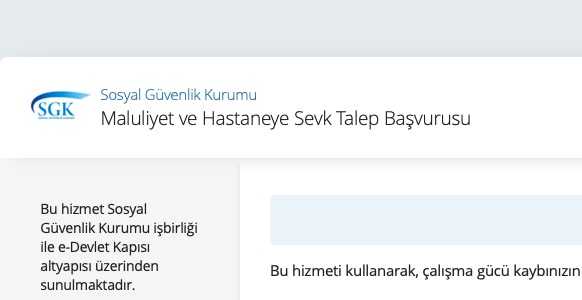 Sosyal Güvenlik Kurulu Maluliyet ve Hastaneye sevk talep başvuruları artık e-devlet sistemi üzerinden alınmaktadır. Bu konuda bir talepte bulunacak olan vatandaşlarımızın e-devlet sistemi üzerinden hızlı, kolay ve doğru şekilde başvuru yapmaları çok önemlidir. Vatandaşlarımız ile devletimizin bilişim sistemi üzerinden irtibatını sağlayan e-devlet sistemi, maluliyet ve hastaneye sevk isteyen vatandaşlara da hizmet sunmaya başlamış durumda. Bu hizmeti kullanarak, çalışma gücü kaybınızın (Maluliyet) tespiti için hastaneye sevk başvurusunda bulunabilirsiniz.