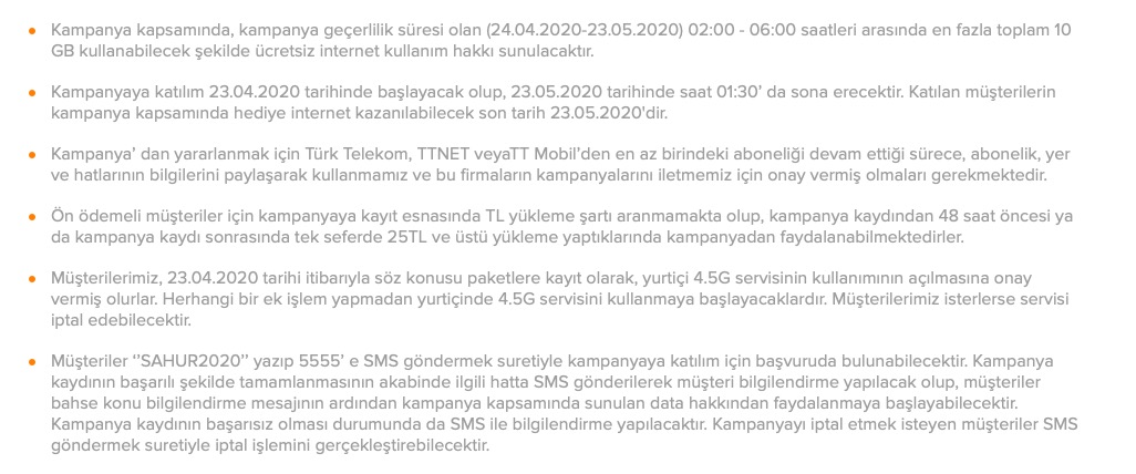 Kampanya kapsamında, kampanya geçerlilik süresi olan (24.04.2020-23.05.2020) 02:00 – 06:00 saatleri arasında en fazla toplam 10 GB kullanabilecek şekilde ücretsiz internet kullanım hakkı sunulacaktır. Kampanyaya katılım 23.04.2020 tarihinde başlayacak olup, 23.05.2020 tarihinde saat 01:30’ da sona erecektir. Katılan müşterilerin kampanya kapsamında hediye internet kazanılabilecek son tarih 23.05.2020’dir.