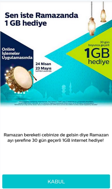 Türk Telekom, 2020 yılı Ramazan Ayı’na özel herkese 1 GB mobil internet hediye ediyor. Üstelik herhangi bir koşul ya da şart olmadan siz de 1 GB internet hediyenizi alabilirsiniz. Kullanmanız için yapmanız gereken tek şey Turk Telekom mobil uygulamasına girerek onay vermek. Diğer operatörler olan Turkcell ve Vodafone de benzer olarak herkese ramazan ayına özel 1GB internet hediye edecek.