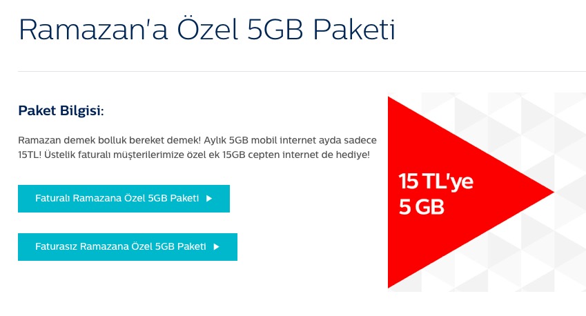 Türk telekom mobil aboneleri 15 TL ücretle ramazan ayına özel tam 5 GB internet alabilirler ve herhangi bir sınırlama olmadan bunu kullanabilirler. Pakete ilk kez kaydolmak için EKSTRA 5GB, 12 ay sonrasında paketten 15 TL’ye faydalanmaya devam etmek için DEVAM EKSTRA 5GB yazıp 5555’e gönderebilirsiniz.