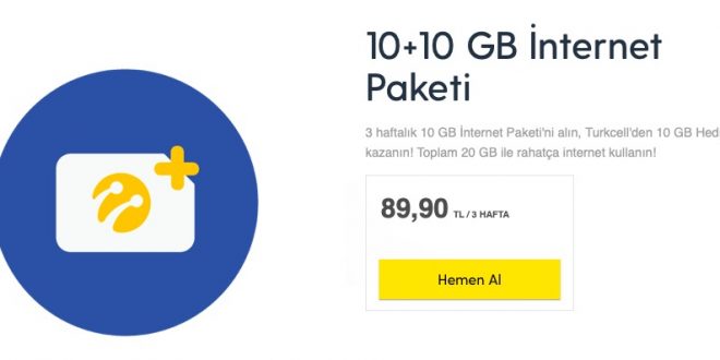 Turkcell, 2020 yılında mobil internet kullanımı artan ve tarifesinde yeterli mobil interneti olmayan kullanıcıları için 20GB internet paketini duyurdu. 20 GB internet paketini 3 haftalık geçerlilik süresi içinde 90 TL beden ile hattınıza tanımlayabilirsiniz. Paketin içeriğinde 10GB mobil internet ve 10GB mobil internete hediye 10GB daha mevcuttur.