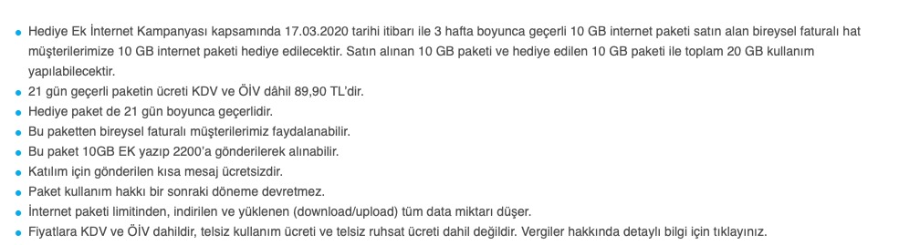 Hediye Ek İnternet Kampanyası kapsamında 17.03.2020 tarihi itibarı ile 3 hafta boyunca geçerli 10 GB internet paketi satın alan bireysel faturalı hat müşterilerimize 10 GB internet paketi hediye edilecektir. Satın alınan 10 GB paketi ve hediye edilen 10 GB paketi ile toplam 20 GB kullanım yapılabilecektir. 21 gün geçerli paketin ücreti KDV ve ÖİV dâhil 89,90 TL’dir. Hediye paket de 21 gün boyunca geçerlidir. Bu paketten bireysel faturalı müşterilerimiz faydalanabilir. Bu paket 10GB EK yazıp 2200’a gönderilerek alınabilir.