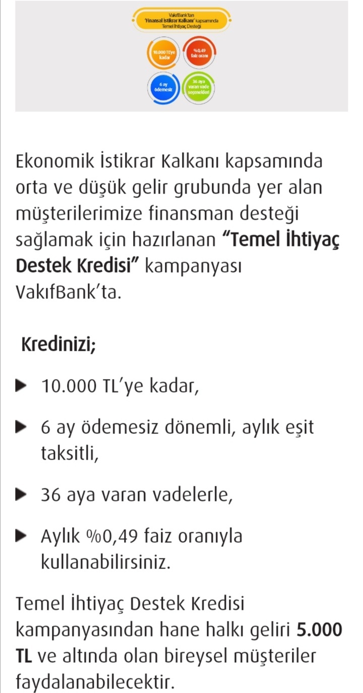 Şu an Vakıfbank merhaba SMS ile başvuru yapıyor. SMS ile destek kredisi alabilirsiniz. Başvuru yapabileceğiniz tutarlar 5 bin 7 bin 500 ve 10 bin TL dir. SMS sonrası vakıfbank size onay SMS i ve başvuru durumunuzu iletecektir. Herşey sorunsuz olduğunda başvurunuz alınacak ve Vakıflarbankası size dönüş yapacaktır. Hata alırsanız yorumlarda yazın, biz size yardımcı ve bilgi verelim.
