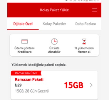 Vodafone mobil kullanıcıları, faturalı ya da ön ödemeli abone farketmeksizin ek 15 GB ramazana özel internete 29TL ödeyerek sahip olabilirler. Ramazan internet paketinin geçerlilik süresi 28 gündür ve size ek 15 GB mobil internet sağlar. Ramazan internet paketini almak için uygulama üzerinden kolay paket seçeceğine hızlıca bakabilirsiniz: