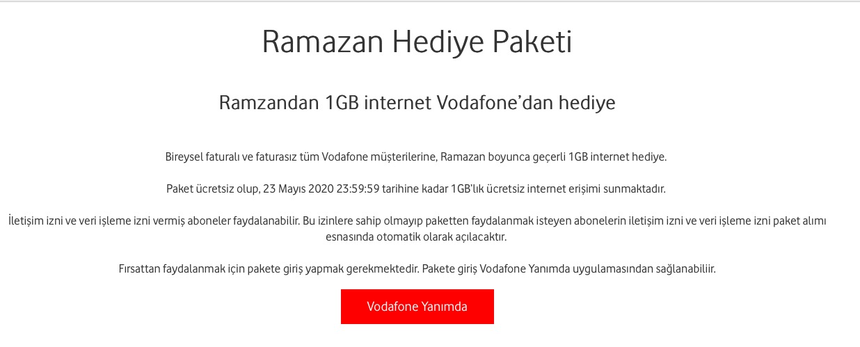 Vodafone, 2020 Ramazan Ayına özel ücretsiz ve bedava internet paketini duyurdu. Vodafone aboneleri faturalı ya da faturasız ön ödemeli olma farkı olmadan tek tıkla mobil hatlarına sınırsız ve zaman kısıtsız kullanılabilecek şekilde 1GB mobil internet tanımlayabilirler. 23 Nisan 23 Mayıs 2020 tarihleri arasında 30 gün boyunca geçerli olan 1 gb mobil internet hediyesi kullanım süreci olarak herhangi bir kısıtlama bulunmamaktadır.